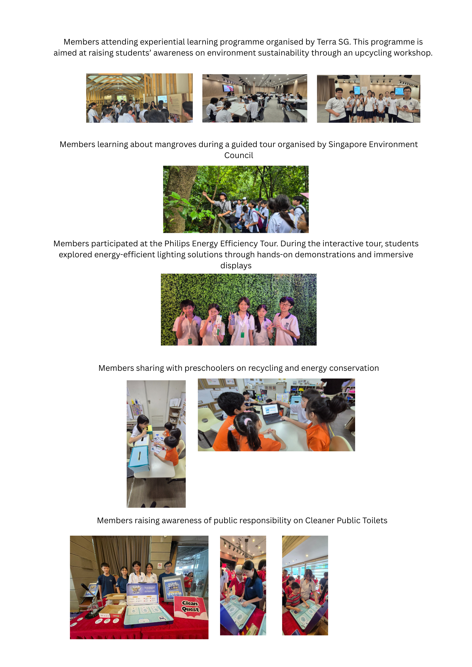 Community: We extend our impact beyond school walls through partnerships with organizations like Terra SG and the Singapore Environment Council. Our members lead learning journeys and even educate preschoolers on the importance of recycling and energy saving.