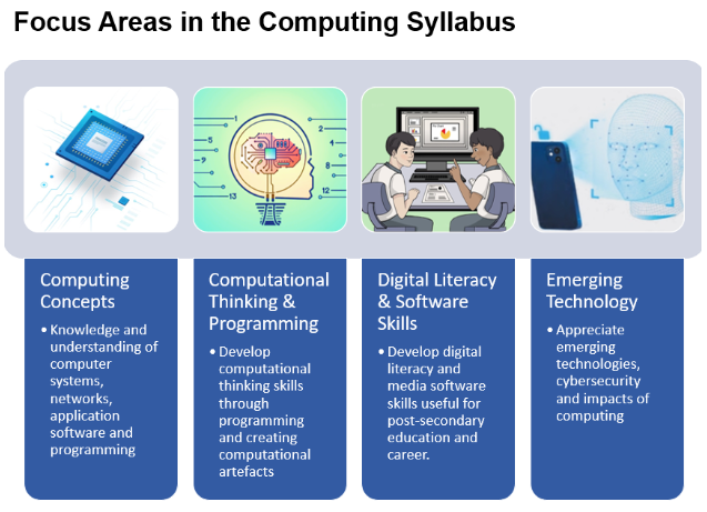 Computing will be offered at G1, G2 and G3 levels for Upper Secondary students starting 2026. The syllabus aims to provide students with the foundation to continue with further studies in computing and skills to participate in a rapidly changing technological environment so that the concepts and skills learnt would also be applicable in other fields that require computing.